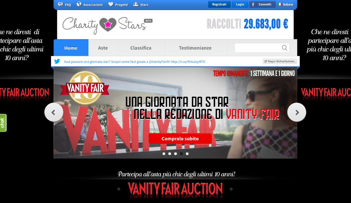 Potrete contribuire a questo progetto partecipando a un’altra golosissima asta: una giornata da star nella redazione di Vanity Fair (attualmente l’asta è arrivata a 250 euro, ma temo salirà parecchio). Chi se la aggiudicherà avrà la possibilità di ricevere il benvenuto del direttore, Luca Dini, e delle altre firme di Vanity, incontrare gli esperti beauty e fashion per qualche consiglio sul look, posare per un servizio fotografico ed essere intervistati da uno dei loro giornalisti. Tutto verrà poi pubblicato sulla home page di Vanity Fair.it e di Style.it!