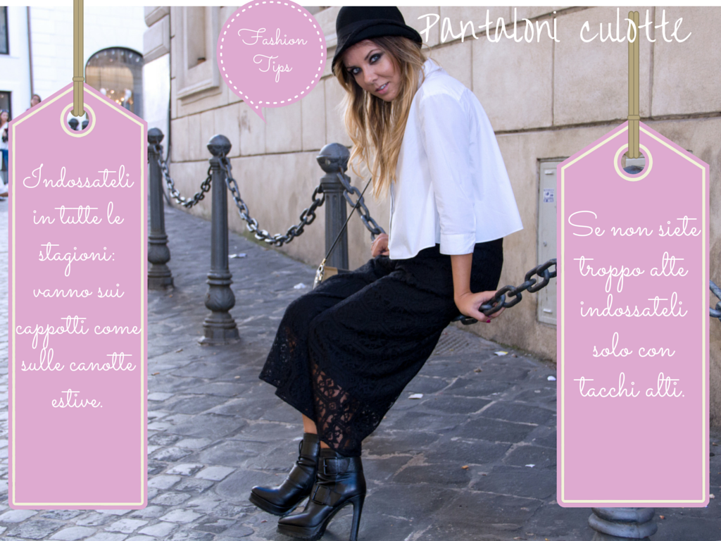 Abbinate i pantaloni culotte (magari neri) a una camicia total white, una collana e scarpe con tacco, come ho fatto io.