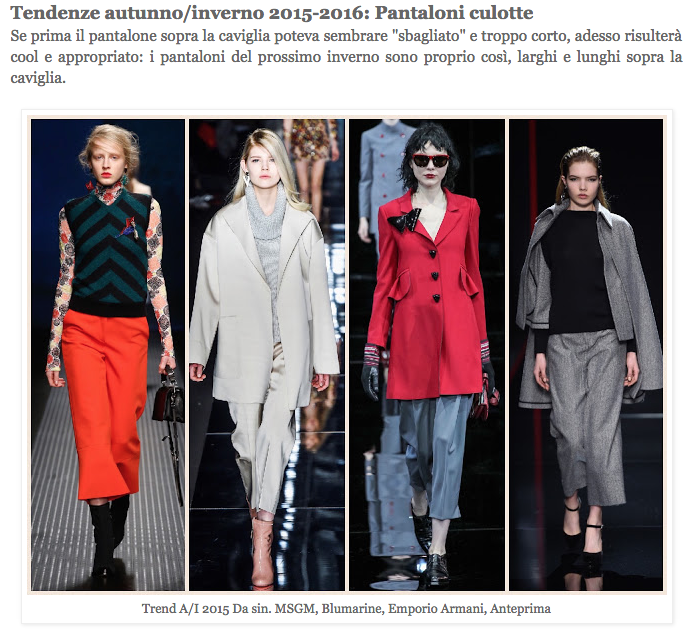 Sì perché c’è chi li associa alle gonne-pantaloni, chi li chiama baggy, chi “pantaloni palazzo capri “(come fa Mango).